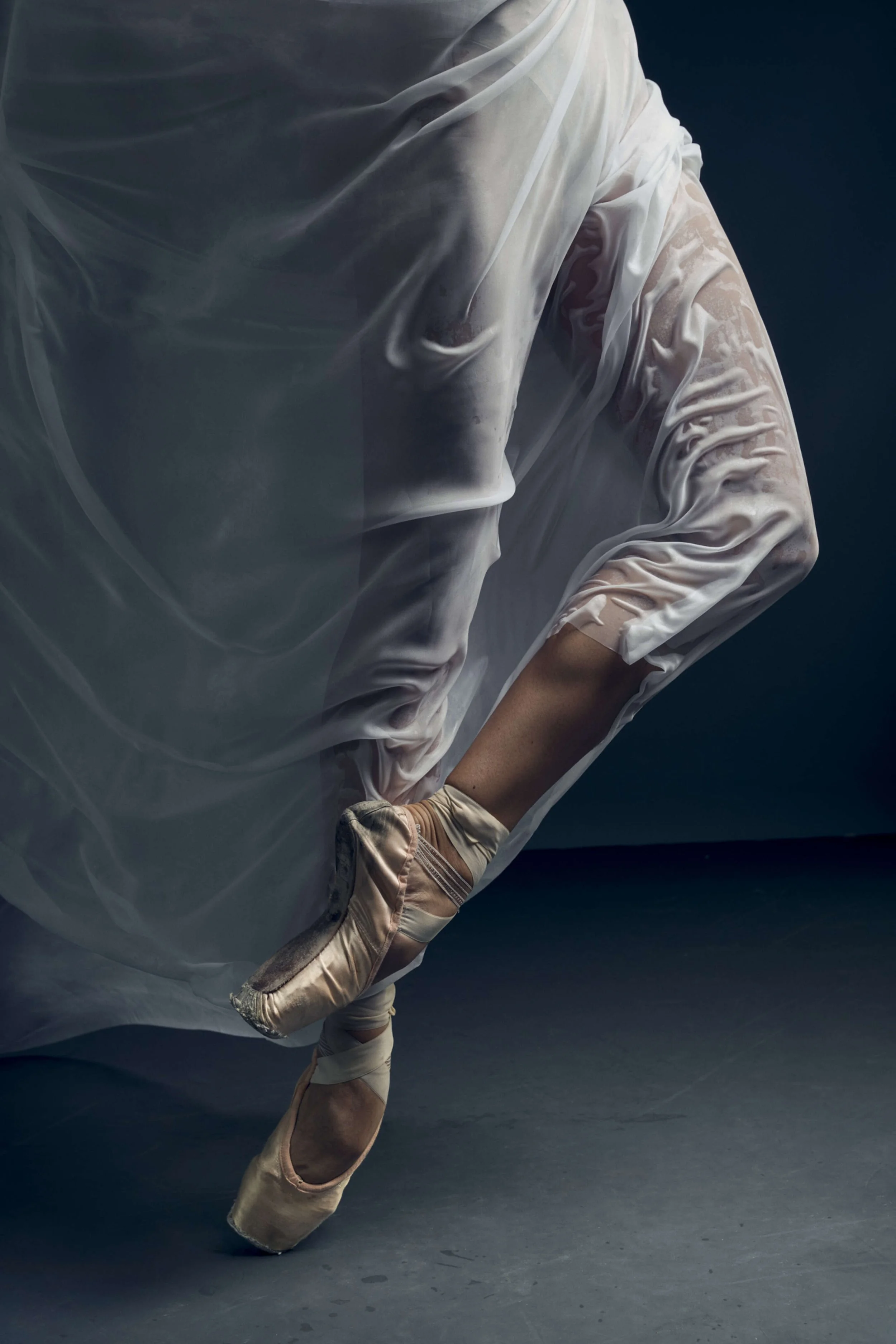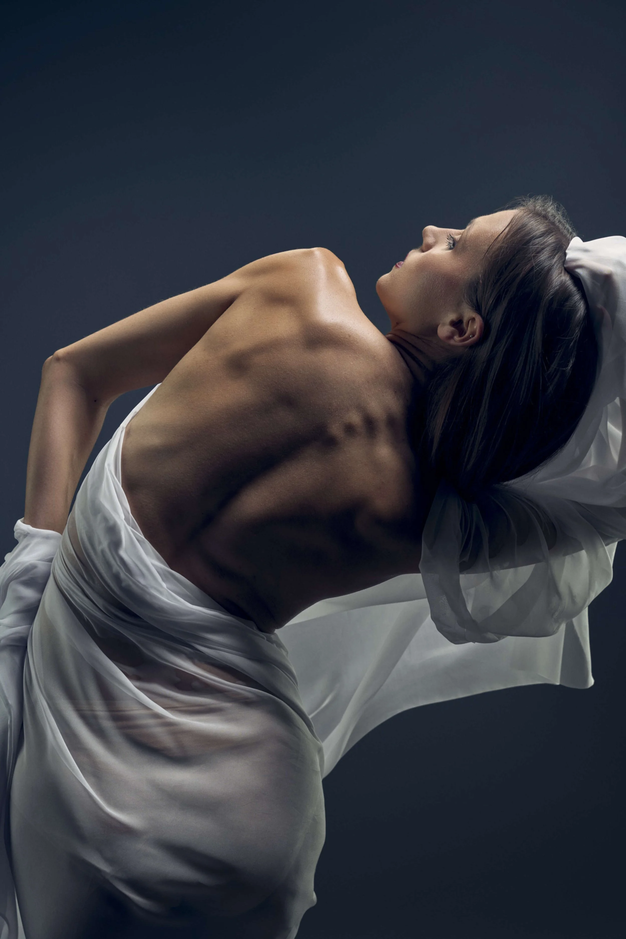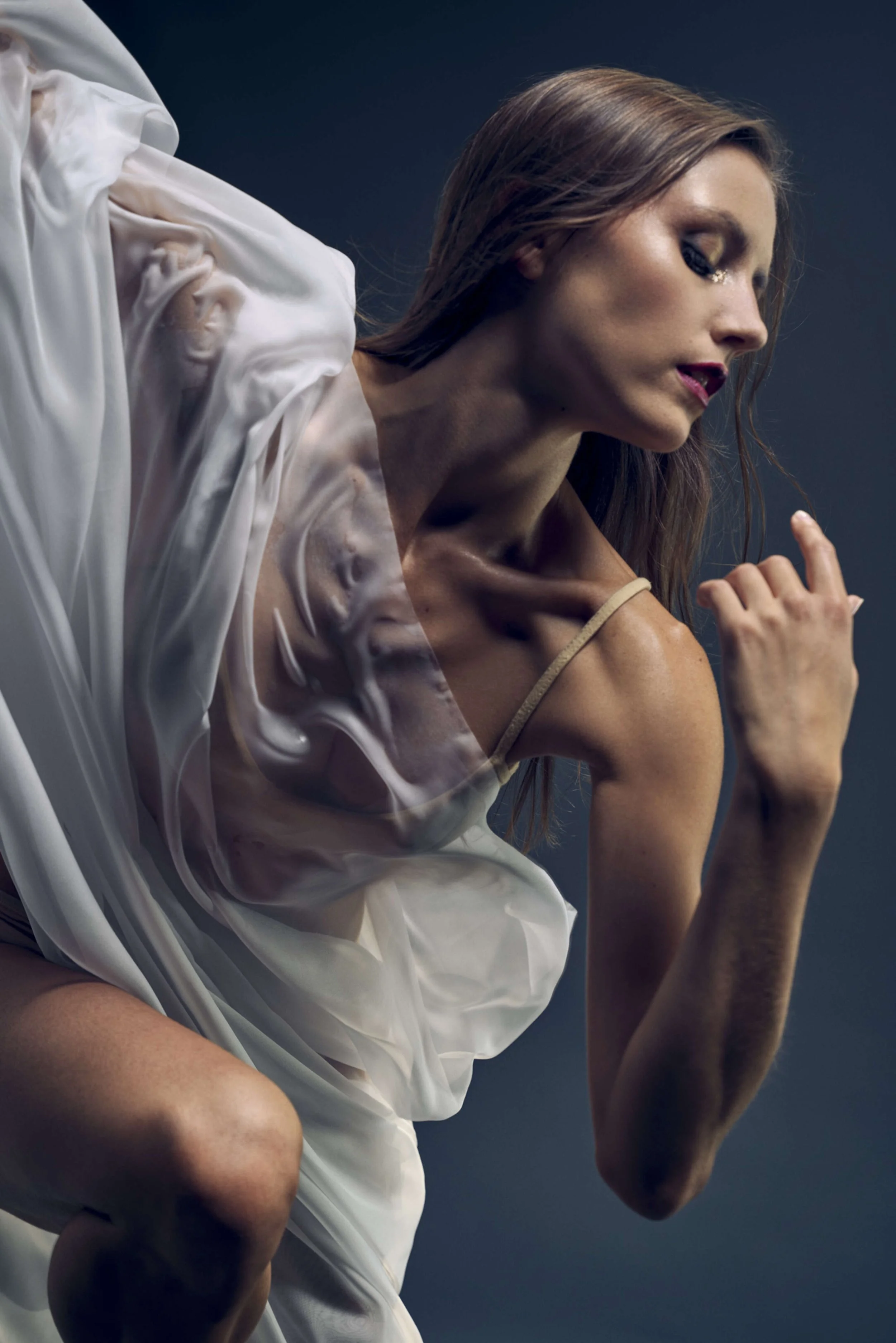 I’ve wanted to do a ‘wet silk’ shoot for so long, as I’m so fascinated by the dragging of the material through space, and the interaction between the material and the dancer. The material is really the partner in the movement, not a prop! Often, I see material being used in dance shoots, but I wanted to put my own slant on it, and so a bit of spritzing was in order, to make it really cling to Kate’s body.