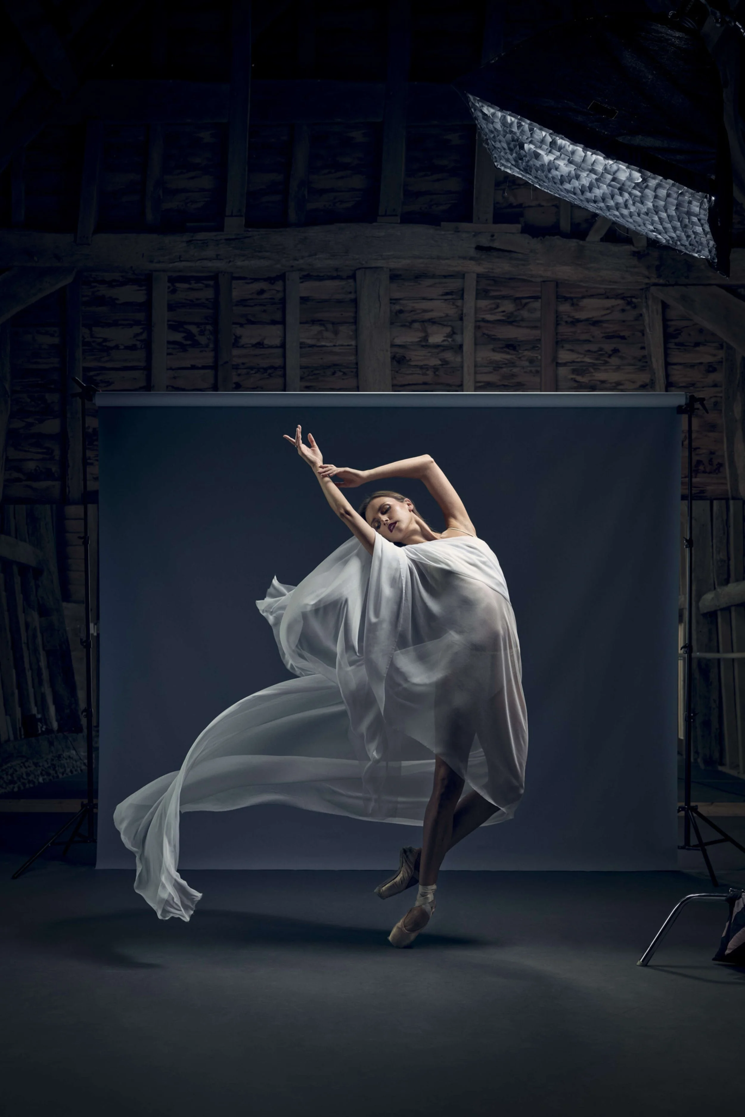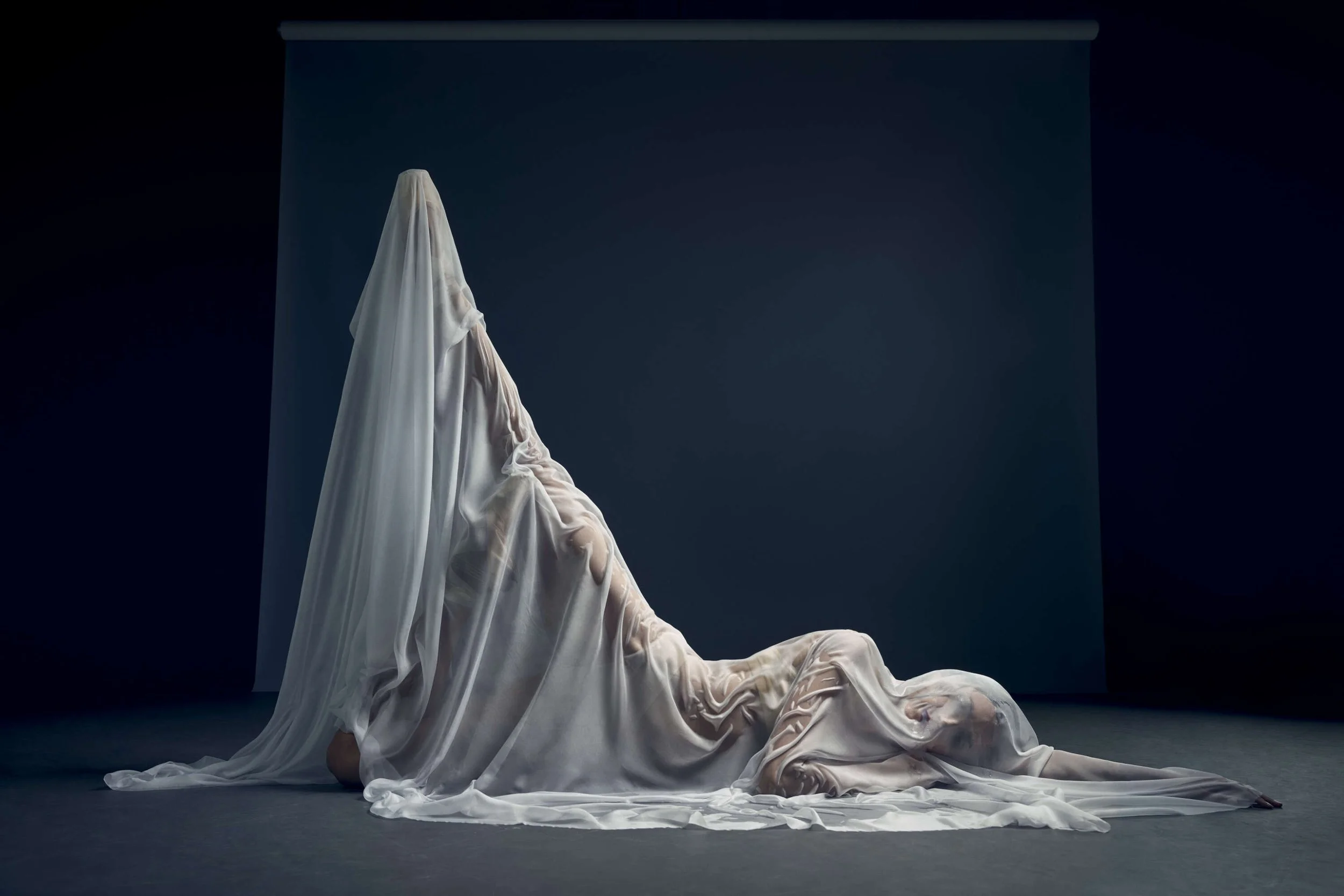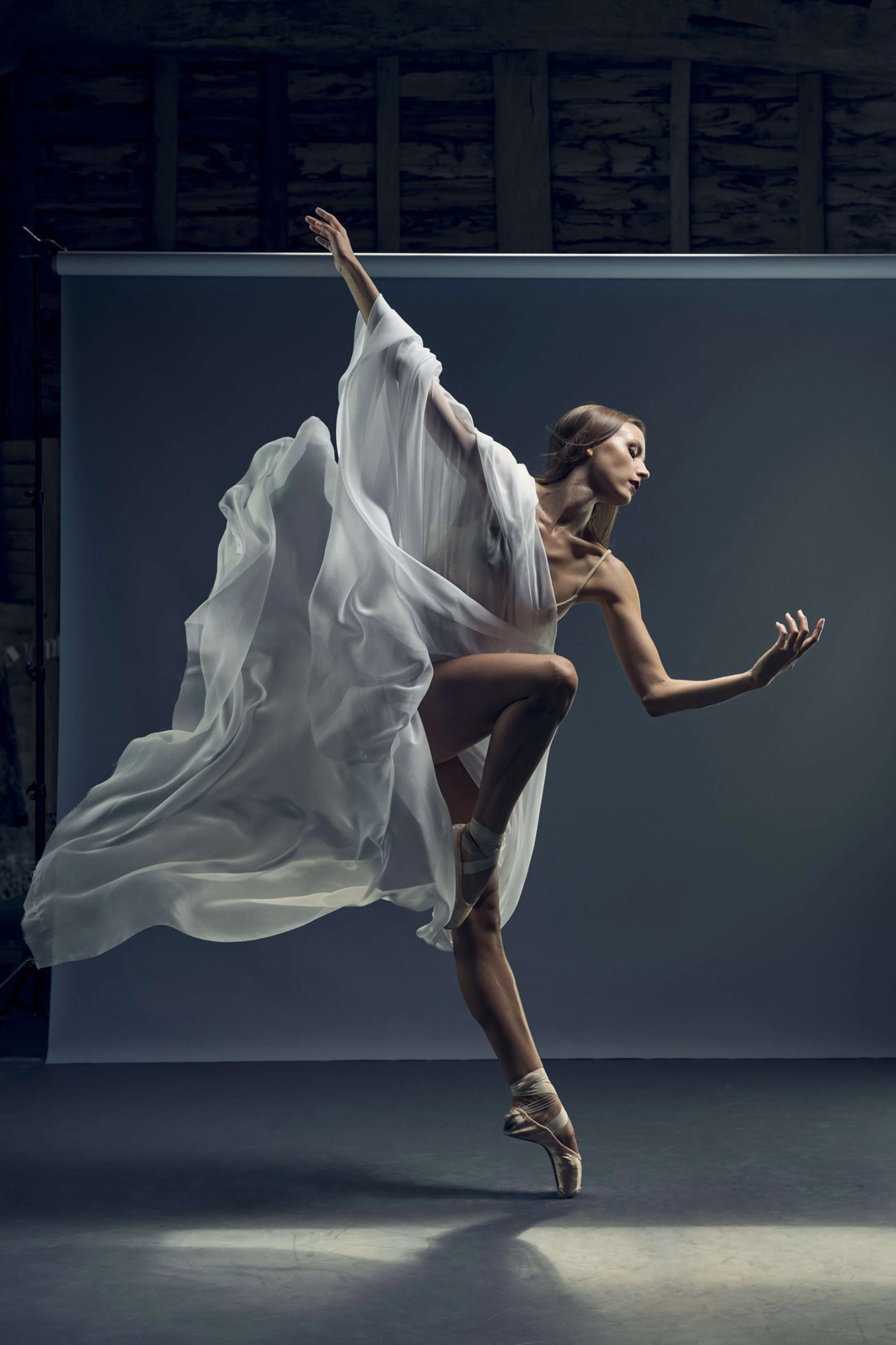 I’ve wanted to do a ‘wet silk’ shoot for so long, as I’m so fascinated by the dragging of the material through space, and the interaction between the material and the dancer. The material is really the partner in the movement, not a prop! Often, I see material being used in dance shoots, but I wanted to put my own slant on it, and so a bit of spritzing was in order, to make it really cling to Kate’s body.